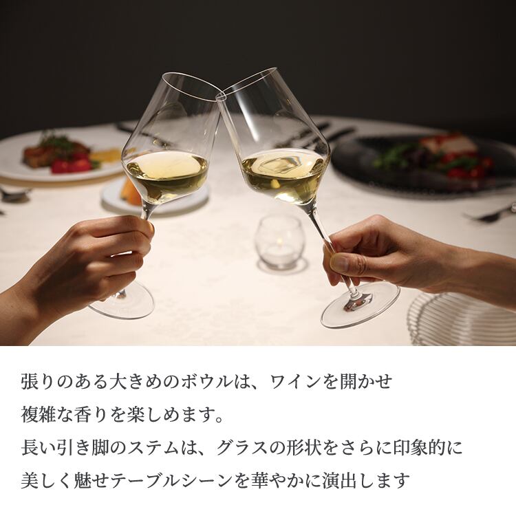 張りのある大きめのボウルから伸びる長い引き脚のステムが、グラスの形状をさらに印象的に美しく魅せています。